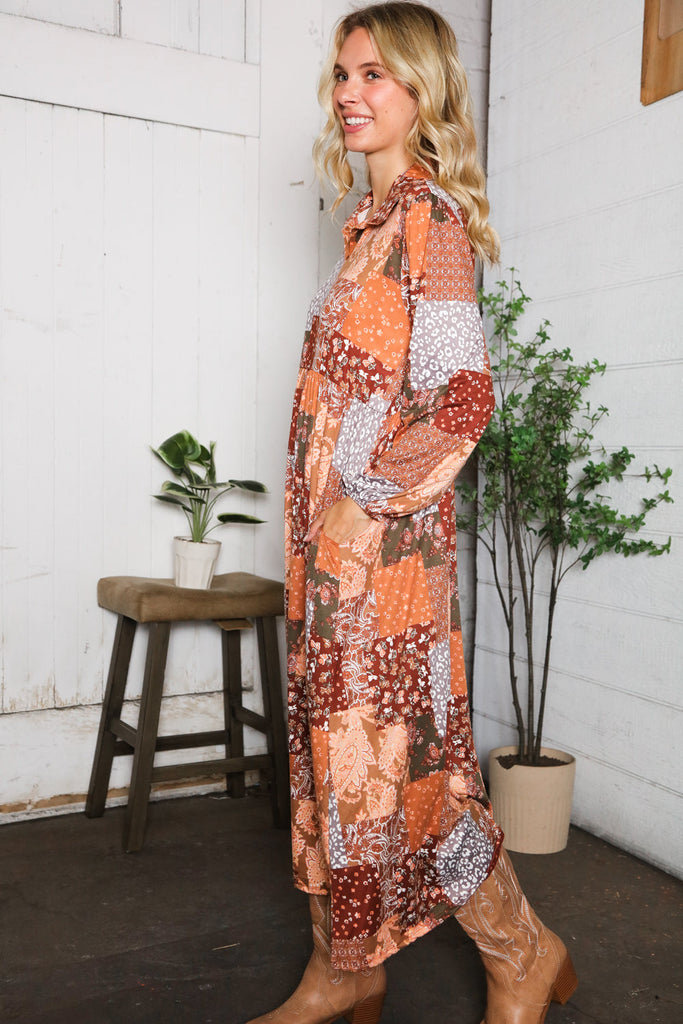 This dress is giving all the fall vibes with its pretty patchwork print. It’s a long length with a fit and flare cut that moves so nicely when you walk. It is a buttery soft fabric. The long sleeves have a slight puff with elastic at the wrist, and the collared neckline gives it a polished touch. This dress also has side pockets.