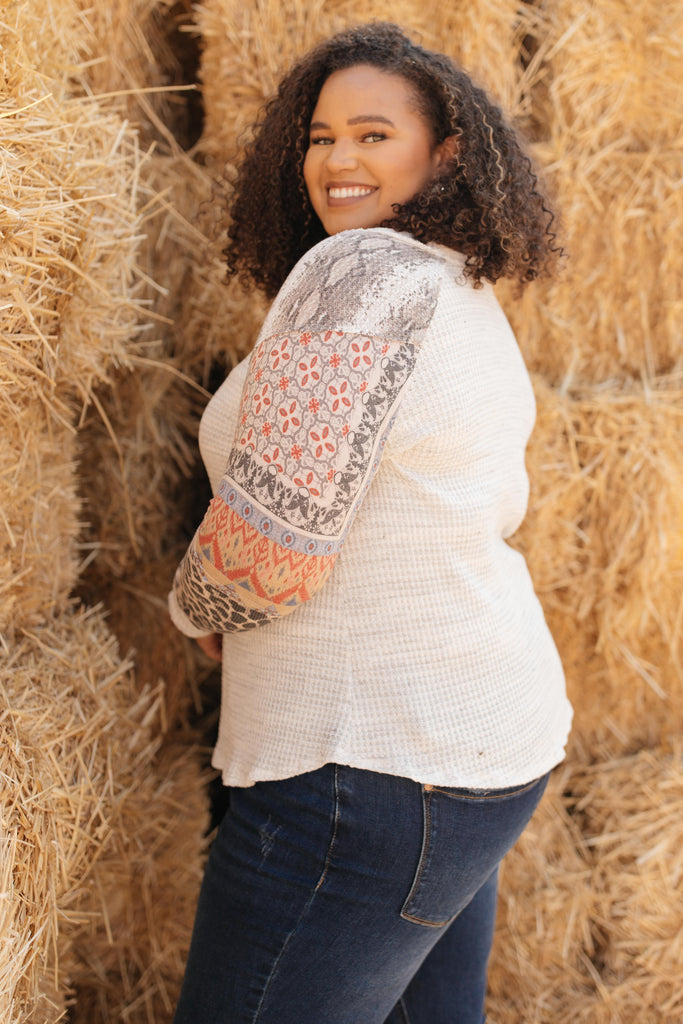 Sometimes the best part of a top is in all of its details! This long sleeve top features bits of snakeskin, abstract print, and leopard patterns all in the same tones and color schemes. This top would look perfect under a cute vest, where you can still show off those sleeves and also begin to dress for the weather.