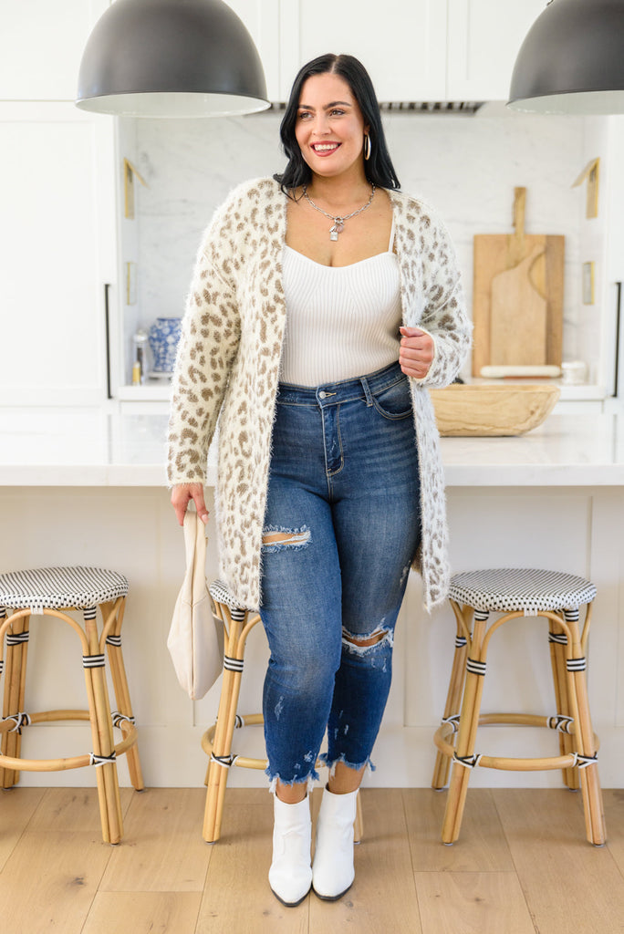 We are falling head over heels for the All Love Fuzzy Eyelash Knit Animal Print Cardigan! This ultra cozy cardi features an open front with drop shoulder detail that falls into slouchy oversized sleeves. The eyelash knit detailing and exposed seams add such a fun and unique twist to your classic cardigan. Pair with a white knit tank, dark wash jeans and heeled boots for a chic look!
