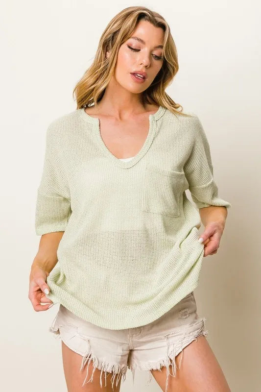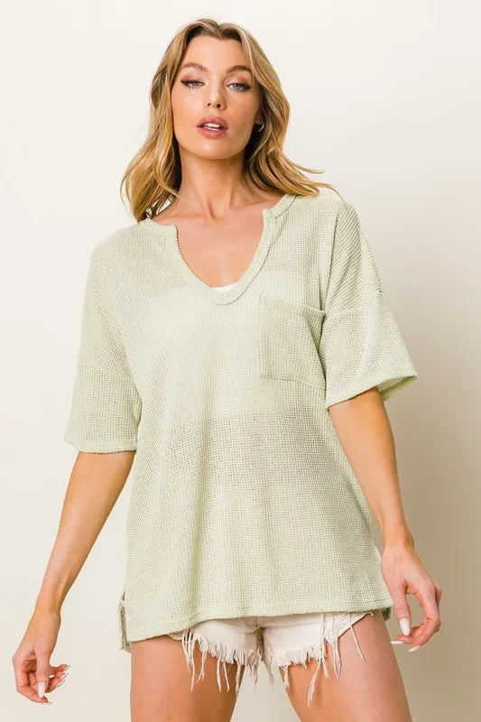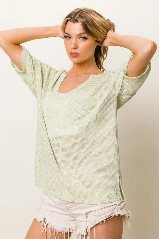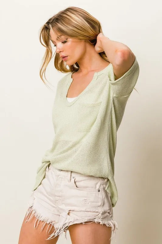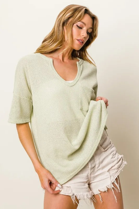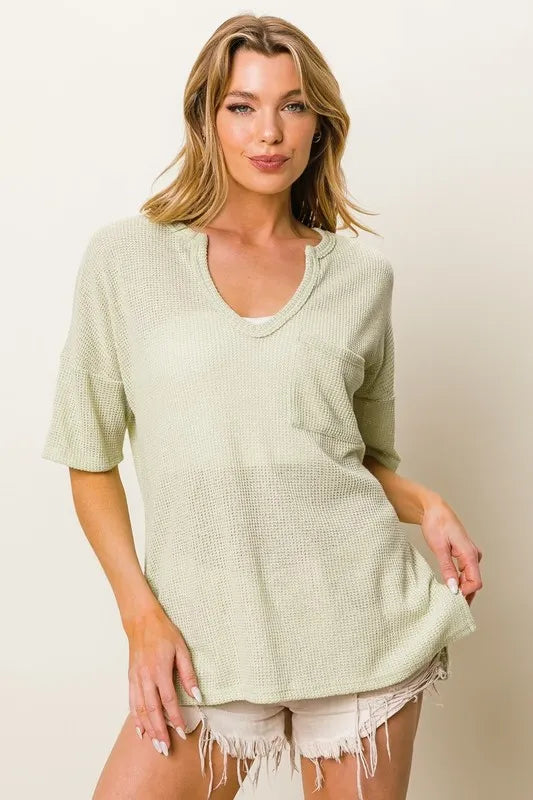 BiBi Boucle Sweater Knit Short Sleeve Henley Top