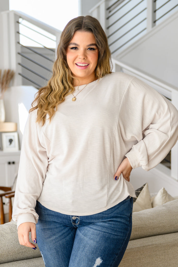 The Brianne Long Sleeve Open Back Top In Ivory features a lightweight french terry knit that shapes a round neckline, with balloon sleeves and an open back cutout with cross detail. This perfect top creates a simple statement you'll love, becoming your new favorite go to!