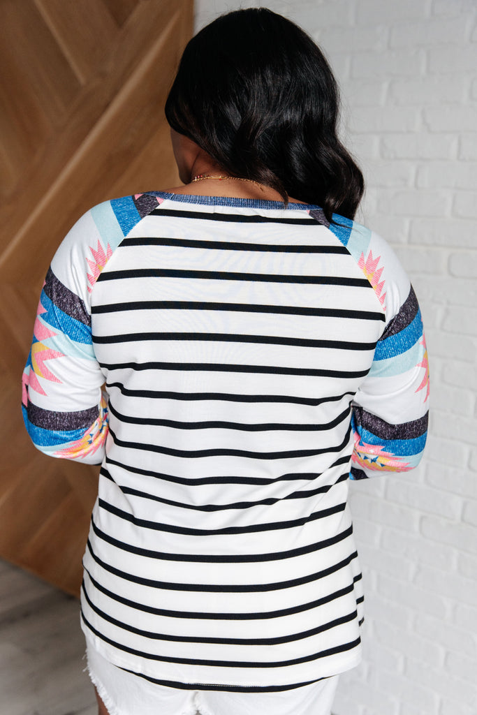 Feel stylish and comfortable in our Change Of Pace Long Sleeved Tee. Crafted from a soft jersey knit, the black and white striped bodice and raglan sleeves featuring an Aztec print combine to create a must-have style. Stand out in the crowd wearing this unique top and get it before it's gone!