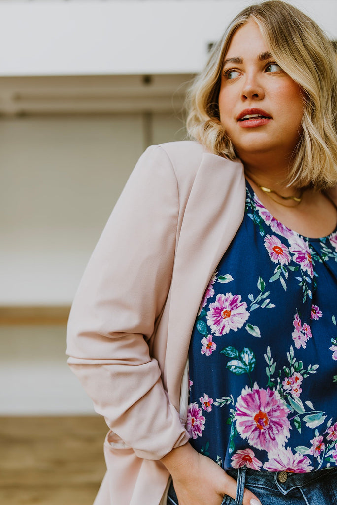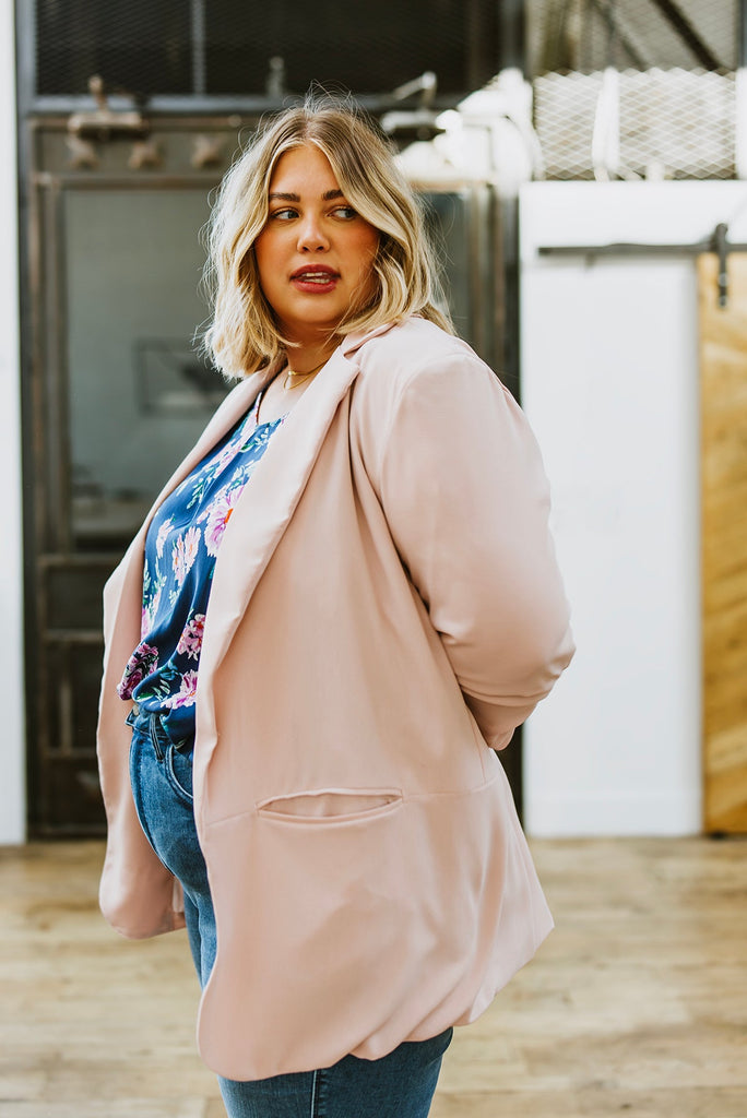 Step up your style game with the Chic In Pink Ruched 3/4 Sleeve Blazer! This stylish blazer features a notched lapel collar, shoulder pads, and ruched sleeves for a feminine touch. The front pockets and fully lined design add practicality to this must-have piece. Elevate any outfit with this chic and sophisticated blazer in a lovely shade of pink.