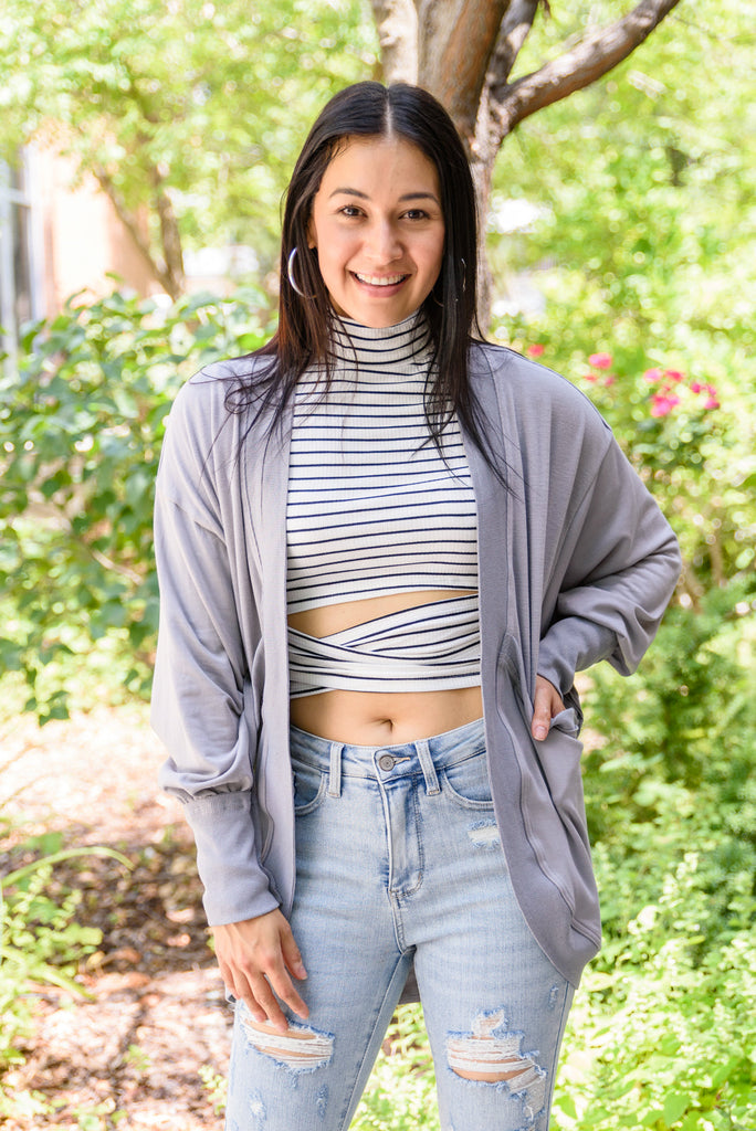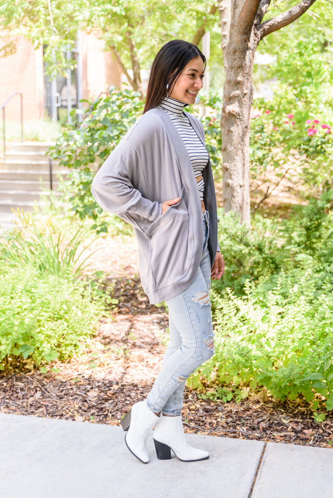 It will be easy to feel good and look good in the Feel Good Cardigan! This cozy cardi is the perfect lightweight layer to add into your rotation. With an open front neckline lined in a contrasting ribbed fabric that also lines the hem, sleeve cuffs, and pockets. The fun details don't stop there, this piece also has raw seam detail, oversized dolman sleeves, and front patch pockets.