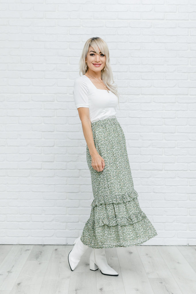 Truly a spring essential because what's a spring wardrobe without a floral print skirt!? A lightweight woven polyester fabric gives this piece a beautiful movement and the shape is adorable, falling mid-calf & decorated in 3 dainty sets of ruffles. Pair this with white booties, and your favorite blouse for the cutest spring look!