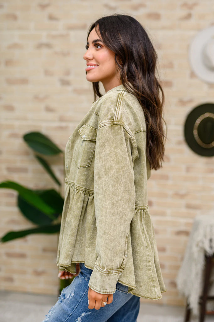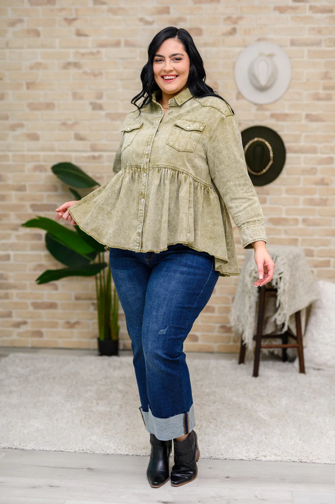 Spice up your wardrobe with the Green Tea Button Up Long Sleeve Top! This fun statement top features a washed, chambray fabric that shapes a collared neckline with a snap button placket and long sleeves finished with functional button cuffs. A relaxed fit bodice features a two snap button chest pocket before ending at a peplum style hi-low hem. Decorative shoulder seams create an adorable western inspired look!