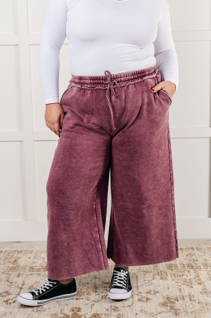 Get cozy in style with our In or Out Wide Leg Cropped Pants. Made from soft fleece with a trendy mineral wash and featuring a drawstring cased elastic waist for the perfect fit. Keep your essentials close with functional side pockets and embrace the cropped length and wide leg for a relaxed look. Raw seam details add some edge.