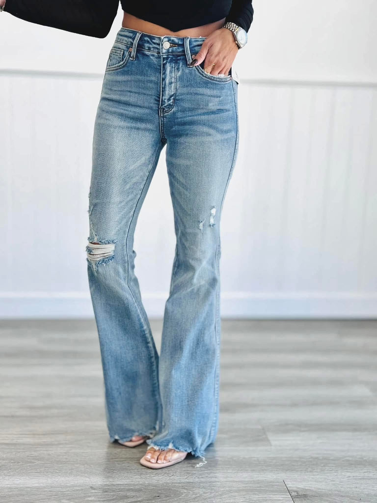 The medium rise tummy control destroy flare jeans are designed to enhance your silhouette while providing ultimate comfort. Featuring a flattering fit, these jeans offer a stylish balance between classic and modern flair. The tummy control feature smooths the waistline, making them perfect for all-day wear. With distressed detailing, they add a trendy edge to your look. Pair them with a fitted top or oversized sweater for a chic ensemble. Elevate your casual wardrobe with these versatile and fashionable flares!