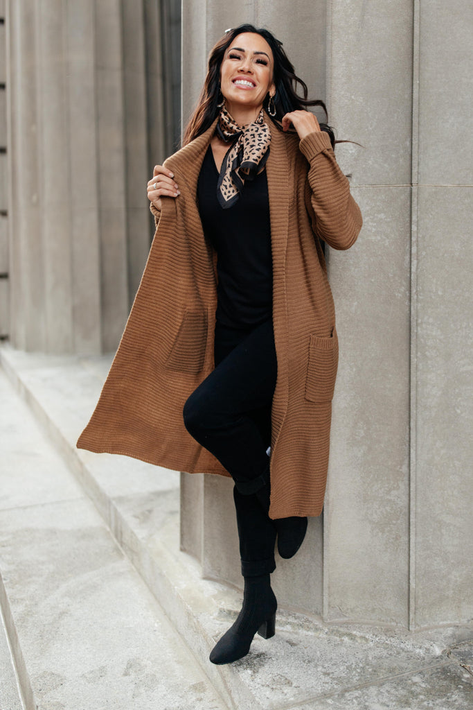 Keywords: Long Cardigan, Tan Cardigan, Brown Cardigan, Fall