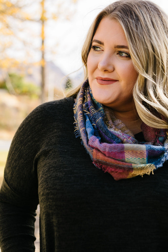 Our Nacho Basic Plaid Poncho was one of our all-time HOTTEST sellers so it was a no-brainer for us to bring you this infinity scarf made from the same plaid fabric! This soft scarf is thirty-three inches in length when laid flat, has fringe at the edges, and wraps around your neck twice. Just like our poncho, it is available in camel and fuchsia.Â