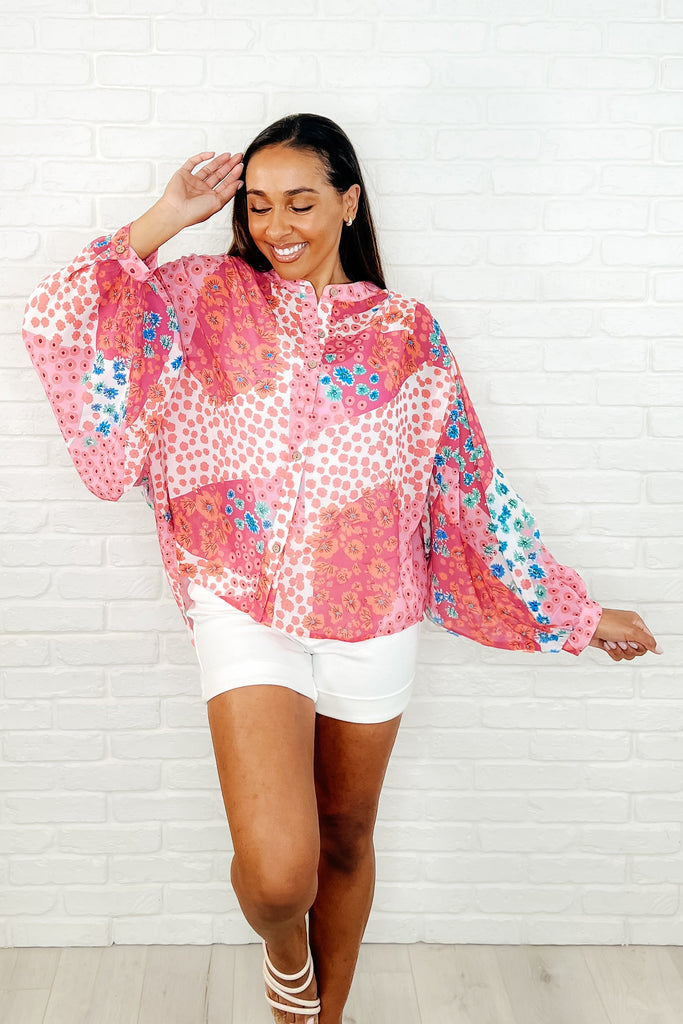 The No Hesitation Mixed Print Blouse is a bold statement piece you’ll reach for again and again. Crafted from lightweight chiffon, it features a banded round neckline and full front button closures for a polished touch. The batwing sleeves create a relaxed, flowy silhouette, while the banded sleeve cuffs with button closures add a tailored finish. The scooped hi-low hemline gives it effortless movement — perfect for dressing up or down. Don’t hesitate — this blouse is a total showstopper!