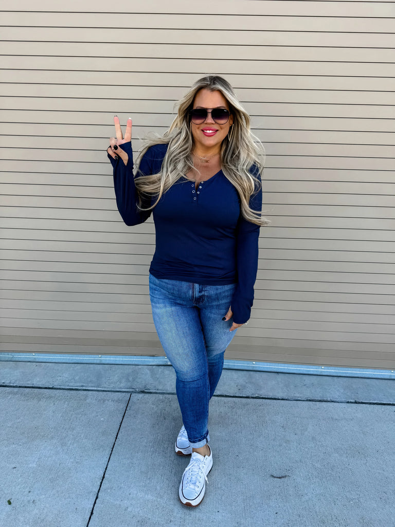 The Brooklyn Snap Henley is curated from the same luxurious ribbed material that makes the beloved Deva tank so popular. The long-sleeve design features three snap buttons on the neckline and thumbhole sleeves. Perfect for layering or wearing on its own!