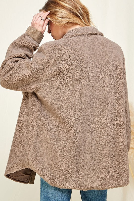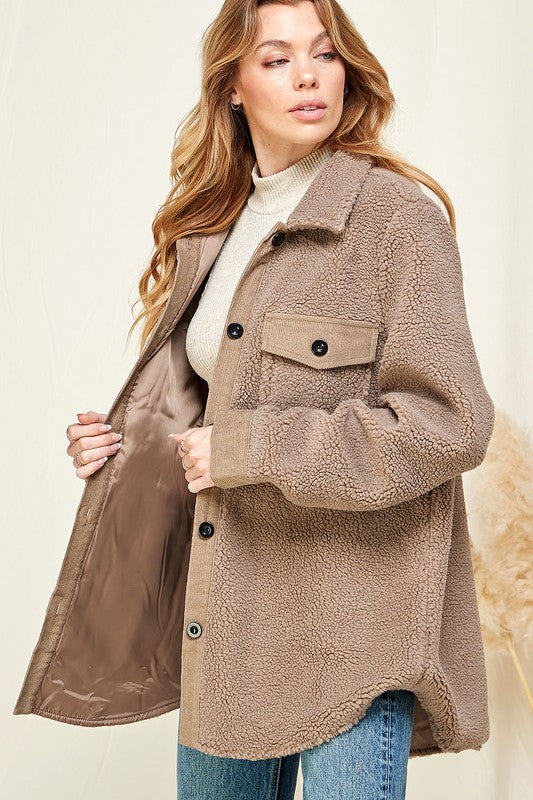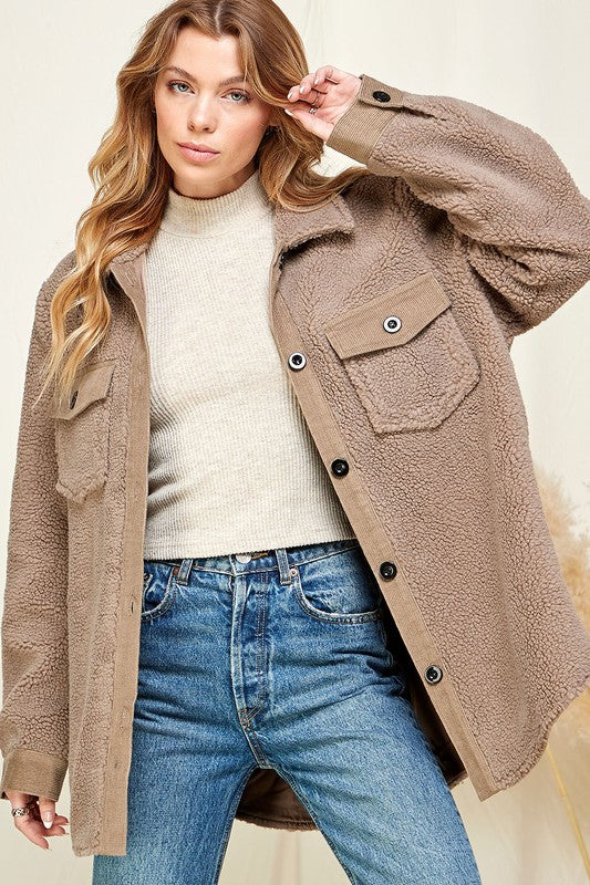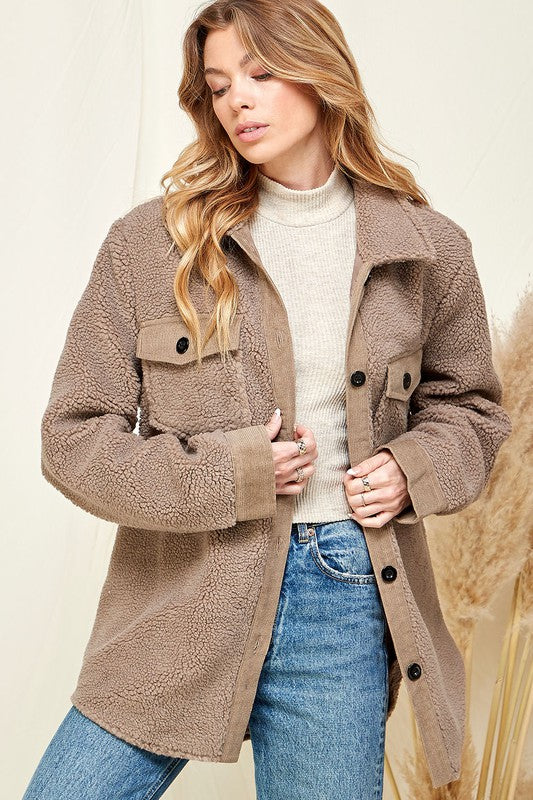 The Estes sherpa jacket is the perfect soft and cozy layering piece to add to your wardrobe! Available in navy or taupe, you can wear it on its own buttoned up, or layered over a tee. It's soft and fuzzy on the outside, lined on the inside and has pockets!