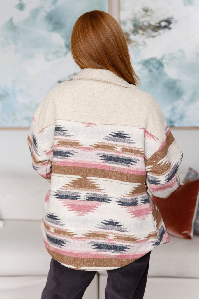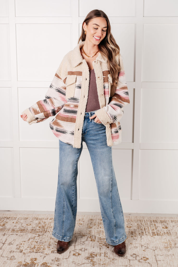 Stay cozy and stylish in our Sedona Sunset Shacket. This must-have item features a sherpa fleece panel, classic brushed Aztec patterned woven fabric, and side pockets. Button front closure keeps you snug in the mid to heavy-weight fabric, while the pockets provide convenience. Make a statement with our Sedona Sunset Shacket!