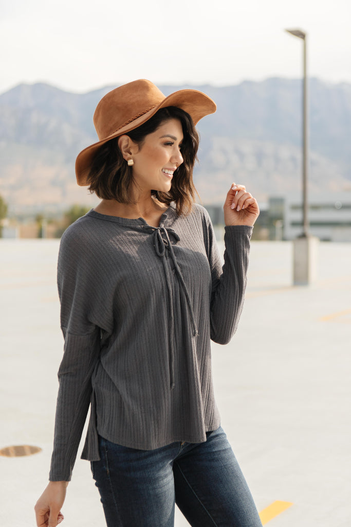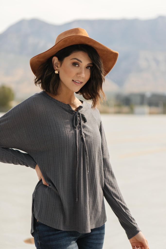 This ribbed top has a unique and fun detail in the front! That lace-up v-neckline is entirely adjustable and will make this basic top so much more striking. Plus, who can turn down a top that comes in other colors?!