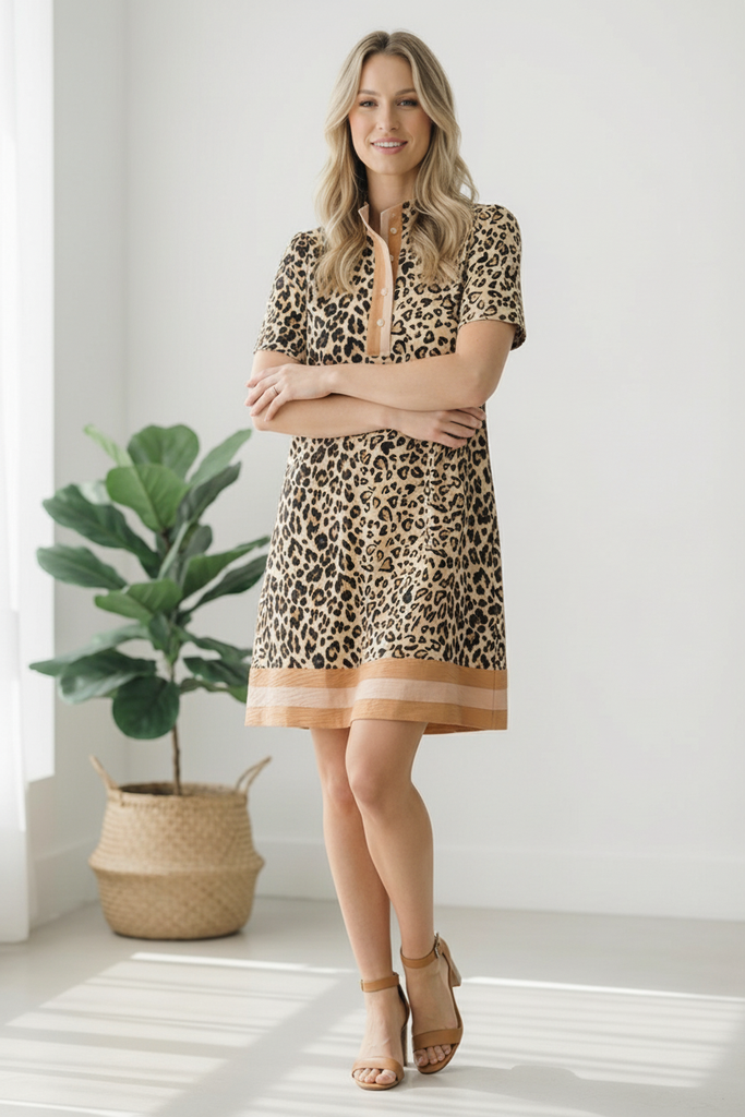 Bold, stylish, and effortlessly flattering, this dress brings standout boutique appeal to any wardrobe. Designed with a relaxed shift silhouette and eye catching animal print, it offers a comfortable yet polished fit that’s perfect for day to night wear. The structured neckline and button front add a chic touch, while the functional side pockets and contrast bottom band detail complete the look with modern, fashion forward charm.